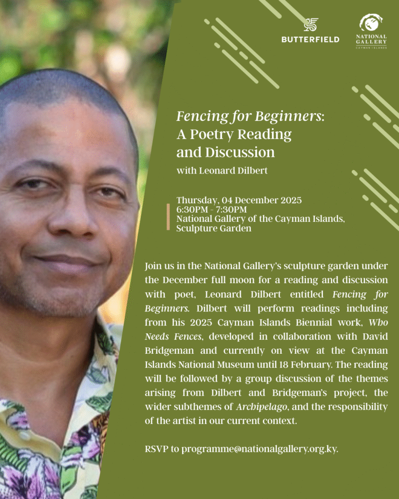 Join us in the National Gallery’s sculpture garden under the December full moon for a reading and discussion with poet, Leonard Dilbert entitled Fencing for Beginners. Dilbert will perform readings including from his 2025 Cayman Islands Biennial work, Who Needs Fences, developed in collaboration with David Bridgeman and currently on view at the Cayman Islands National Museum until 18 February. The reading will be followed by a group discussion of the themes arising from Dilbert and Bridgeman’s project, the wider subthemes of Archipelago, and the responsibility of the artist in our current context. RSVP to programme@nationalgallery.org.ky or register here.